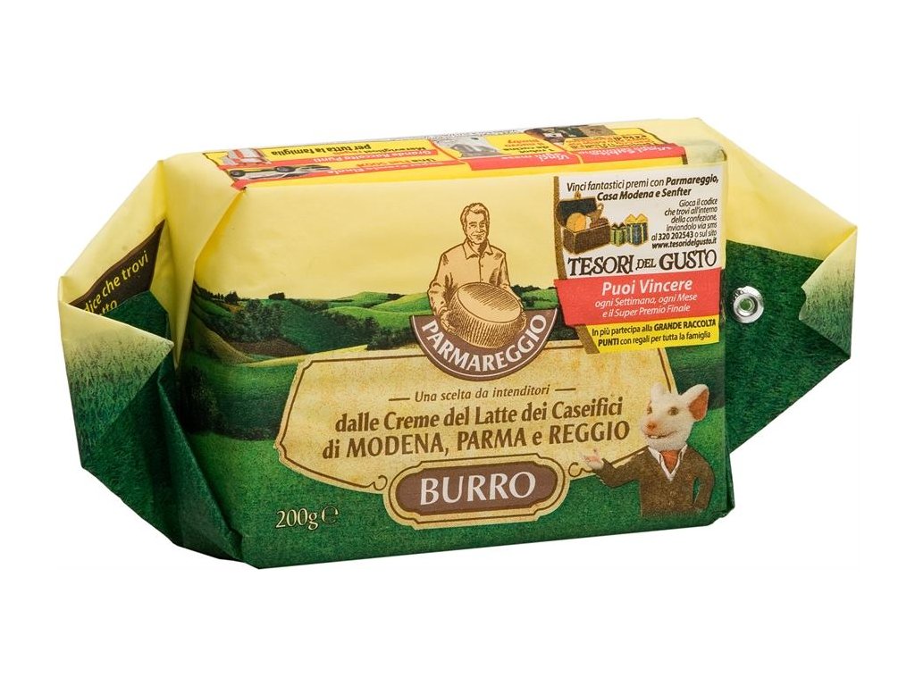 Parmareggio Burro je máslo s jedinečnou, delikátní a krémovou chutí. Univerzální použití v kuchyni jako ingredience pro ochucení těstovin a pro připravi chutných teplých receptů. Výborné samostatné s chlebem.