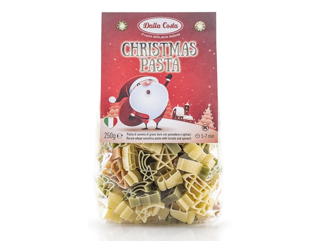 Vánoční tříbarevné těstoviny ve tvaru stromeček, dáreček, svícen a kometa ochucené rajčaty a špenátem. Těstoviny vyrobené na bronzových matricích, díky kterým mají těstoviny drsný, porézní povrch a tak na nich skvěle drží omáčka.