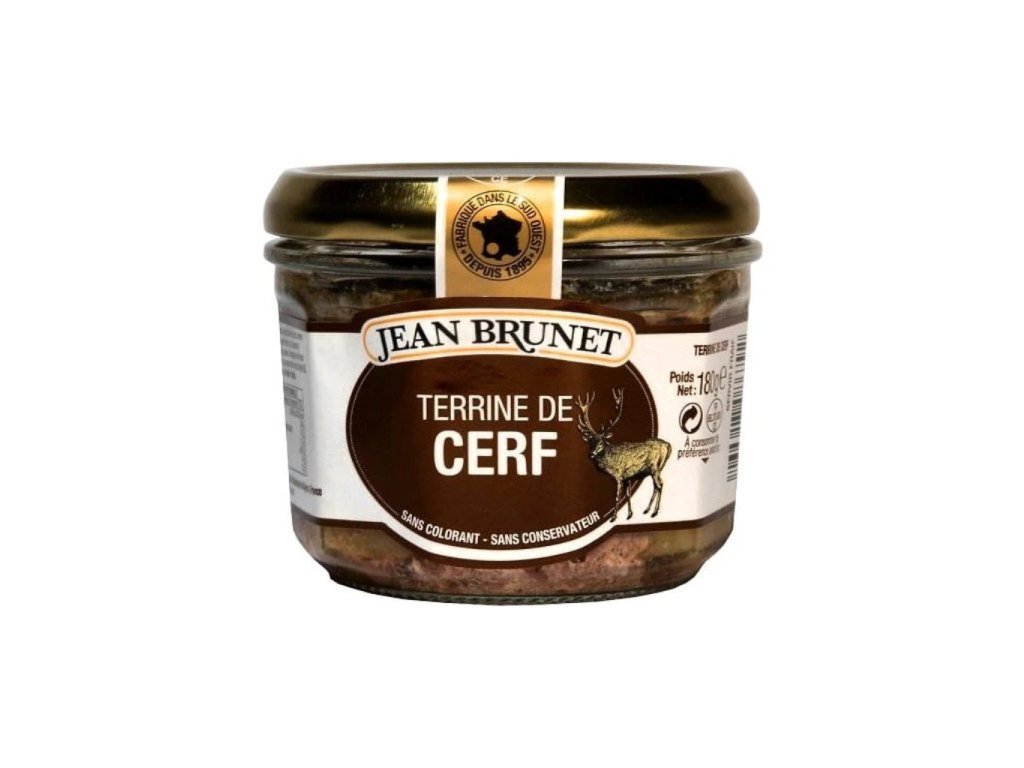 Jean Brunet Jelení paštika je poctivá francouzská terina vyrobená z převážně vepřového masa obohaceného kvalitním jelením masem (20 %). Výsledkem je harmonická chuť divočiny, která dobře snáší doprovod koření a nádech muškátového oříšku či pepře. Bez umělých barviv, konzervantů či emulgátorů — a přitom s výrazným charakterem. Hodí se na čerstvé pečivo, k nakládané zelenině či jako rustikální pohoštění.